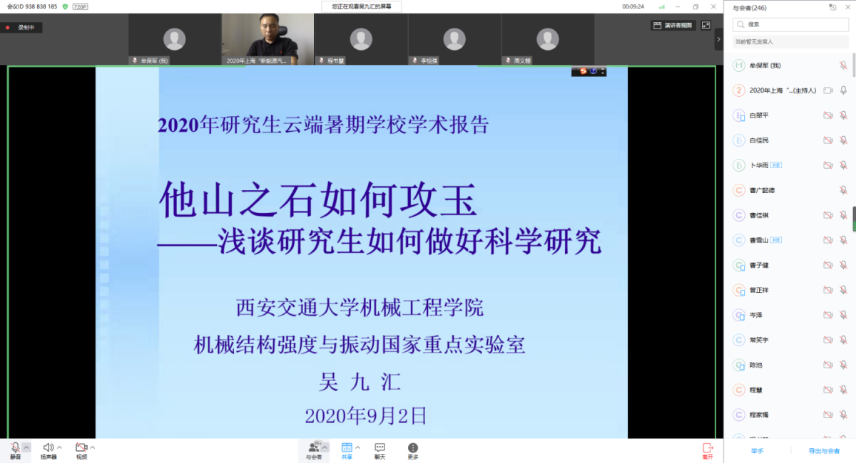 2020年9月2日9:00-11:00,西安交通大学吴九汇教授在华为云会议平台暑期学校学员做题为《他山之石如何攻玉——浅谈研究生如何做好科学研究》的线上专题讲座。此次讲座由开云kaiyun官网副院长崔国华教授主持,257名暑期学校学员在线聆听讲座。