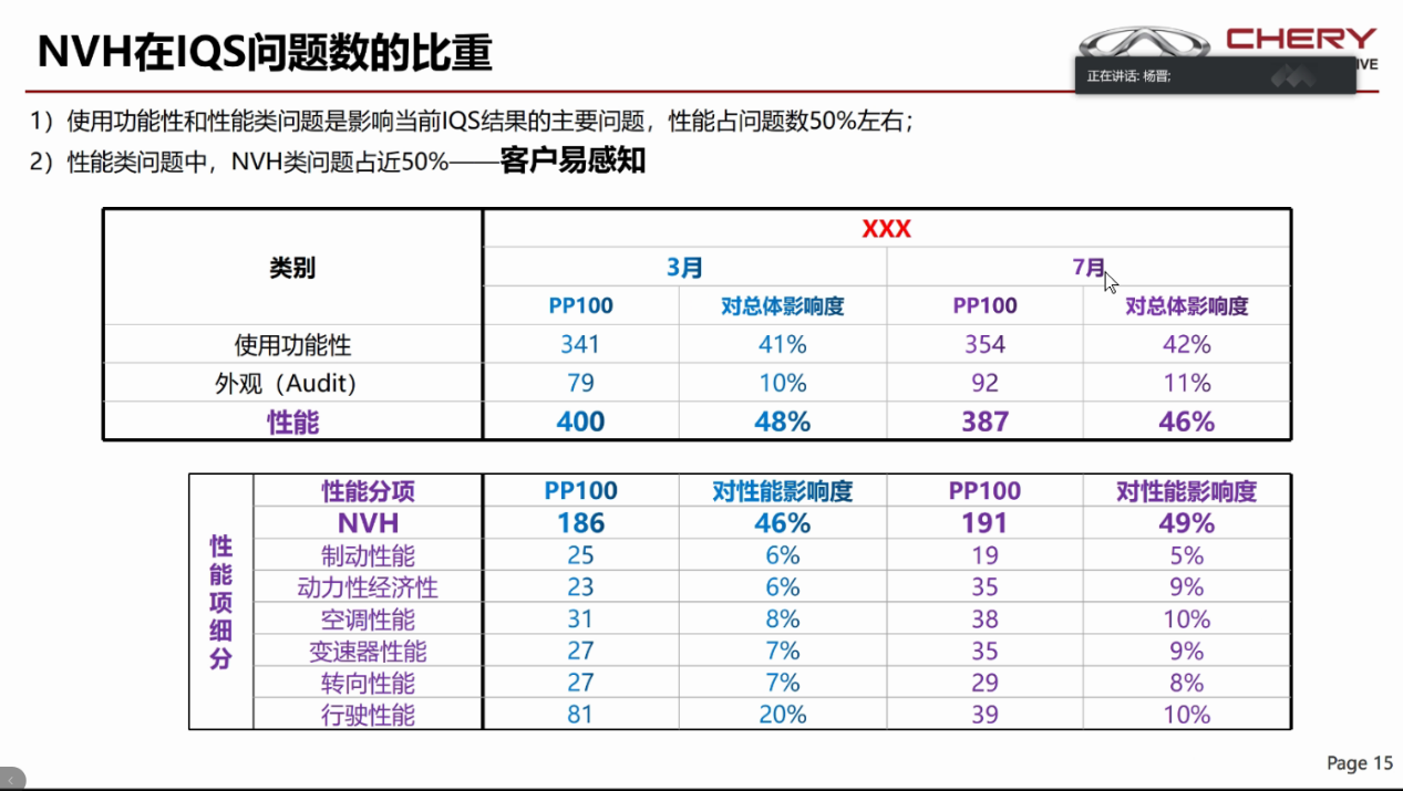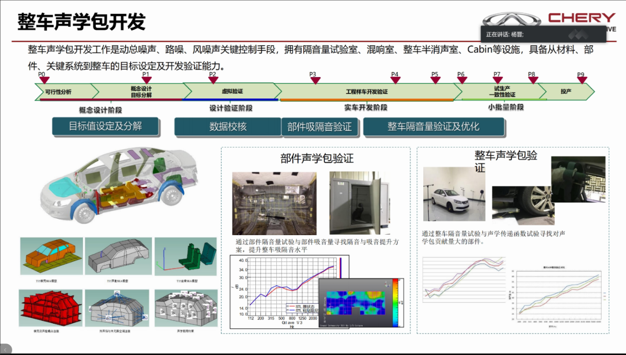 杨教授以公司的历史文化和发展概况为切入点,结合个人经历,引出正向开发的研发体系流程,以及奇瑞汽车由弱到强的发展历程,对汽车的NVH性能进行了一个全面的介绍。会议报告介绍了奇瑞公司在2018年和2019年对新车质量问题的统计和分析,其中NVH在IQS问题数的比重基本占了一半,并且结合2019奇瑞IQS前20位问题,例如:车体内部气味、空调系统鼓风机噪声,发动机异响等,进行了详尽的分析;讲解了整车NVH、性能开发流程以及动总开发、平台开发等内容,同时指出了性能开发过程中的处理难点和时间统筹问题;展示了整车性能开发流程框架、T1X平台、整车声学包开发、整车风燥开发、整车路噪开发、整车异响、整车总动开发,以及变速箱whine噪声优化和发动机重点子系统NVH的开发成果;最后探讨了整车NVH性能开发在风噪、路噪、个性化的加速声音、电动车的隔振设计等方面的应用前景。