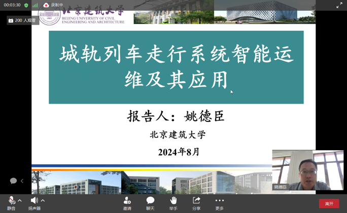 2024年8月27日下午14:00,通过华为云会议视频平台,北京建筑大学机电与车辆工程学院姚德臣教授为暑期学校作题为《城轨列车走行系统智能运维及其应用》的线上专题讲座。本次讲座由开云kaiyun官网院长方宇教授主持。