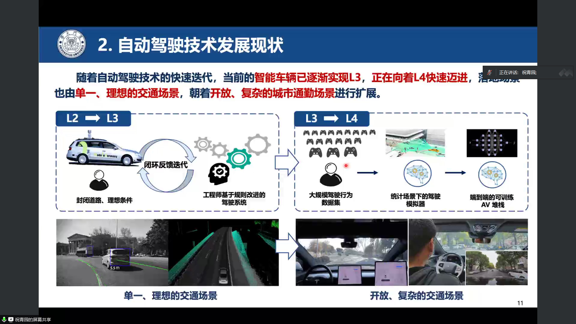 祝教授首先阐述了不同环境、气候和地理条件对自动驾驶系统感知能力的挑战,以及仿真模拟技术在解决这些问题中的重要作用,并提出当前应用于自动驾驶测试的两种主要仿真方案:基于真实数据融合的仿真方案和基于虚拟环境建模的仿真方案。上述两种方法各有优势,但单一使用仍无法完全满足高阶自动驾驶系统开发的需求。为此,祝教授详细讲解了包括激光雷达(LiDAR)、视觉传感器和惯性测量单元(IMU)的仿真。在此过程中,LiDAR作为自动驾驶系统的重要感知设备,能够生成高精度的三维环境信息;视觉传感器则为自动驾驶提供实时的场景感知数据,支持障碍物检测和车道识别等功能;IMU则通过测量旋转和加速度数据,为车辆的姿态和定位提供支持,而高保真的传感器仿真技术则为实现高精度自动驾驶仿真测试奠定了研究基础。最后,祝教授提出了基于上下文聚合网络的航拍建图方法,以解决无人机建图过程中存在的精细化不足问题,使得场景模型能够得到更为精确的重构。