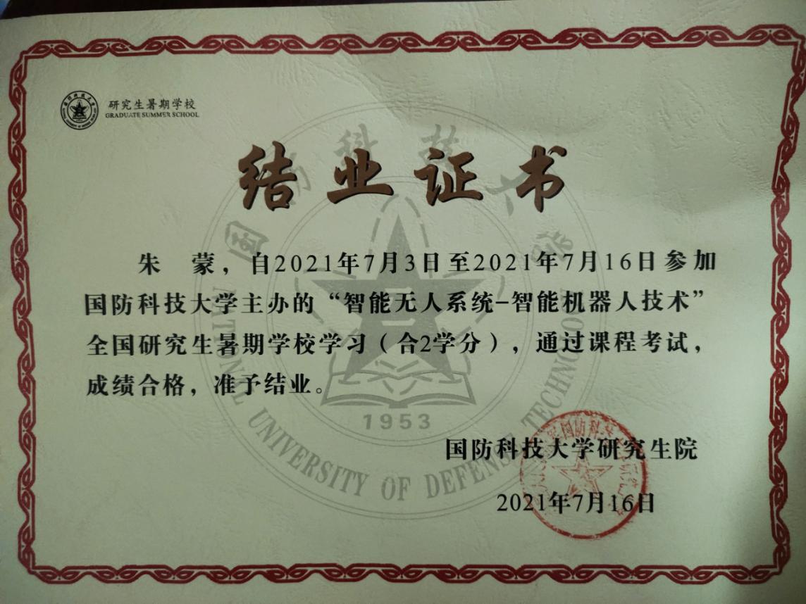 2021年7月3日-7月16日,经过个人携论文申报、主办单位严格遴选、导师指派,我院2019级研究生白翠平和2020级研究生朱蒙参加了由国防科技大学智能与科学学院主办的2021年“智能无人系统-智能机器人技术”全国研究生暑期学校。来自中科院精密测量院、北京航空航天大学、北京理工大学、大连理工大学、厦门大学、吉林大学等全国各地40余所高校的76位控制科学与工程以及机械工程学科的博士、硕士研究生和本科生参加了此次学习、培训。