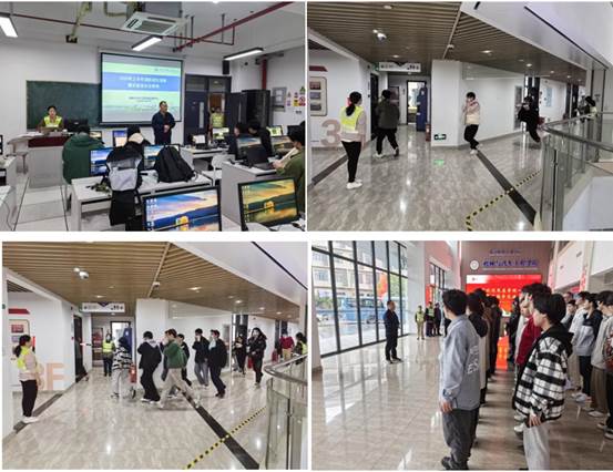 学院高度重视本次消防演练,提前制定消防应急疏散方案,明确疏散路线、岗位分工及注意事项。演练前,实验中心副主任丁霞老师从火灾预防、实验室常见安全隐患、逃生方法及注意事项等方面进行了详细讲解,强调“弯腰低姿、湿巾捂口鼻、有序撤离”的核心要点。随着急促的警报声在教室内骤然响起,全体师生迅速进入应急状态,在楼层引导员的指挥下,学生按照既定路线使用湿毛巾捂住口鼻俯身撤离。所有学生在指定区域集合后,立即清点人数并上报,确保无一人滞留。整个演习过程紧张、有序,达到了消防演练的目的。演练结束后,实验中心主任马西沛老师对本次消防逃生演练进行了总结,强调了正确进行消防逃生的重要性。