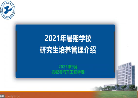 2021年9月2日9:00-10:00,通过华为云会议视频平台,向暑期学校学员们展示了我校的实验室的基本情况,包括电池测控及热管理实验室、汽车电控实验室、智能机制机器人实验室、先进制造与检测技术实验室等。通过录制和讲解各个实验室及设备的使用情况,使学员们更清晰更直观的了解我校实验室的基本情况,为学员中即将进入我校的研究生新生留下了深刻的印象。