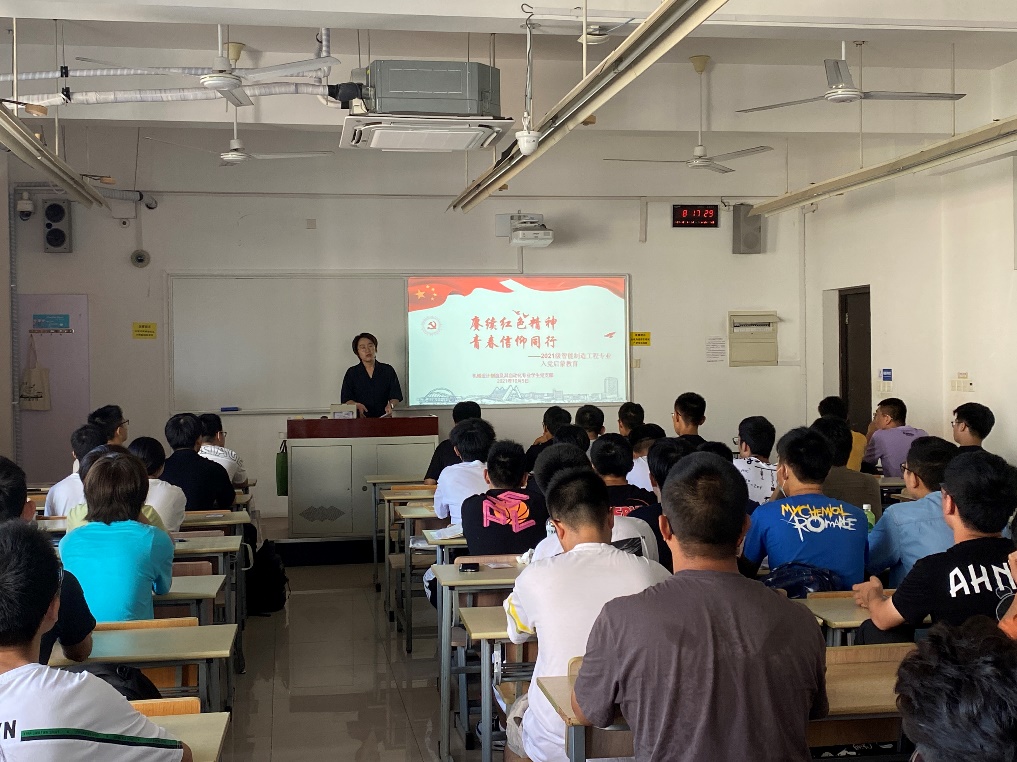 10月5日上午,在教学楼B310机械设计制造及其自动化专业学生党支部以“赓续红色精神、青春信仰同行”为主题对2021级智能制造工程专业新生进校了入党启蒙教育。党支部书记汪文婷老师分别从中国共产党是怎样的执政党?、学习优秀共产党员、向身边的党员学长学习、怎样填写入党申请书?党支部王昊同志、方翼婷同志谈入党初心。此次入党启蒙教育鼓励青年学子在思想上积极向党组织靠拢,以实际行动为实现中华民族伟大复兴的中国梦贡献力量。