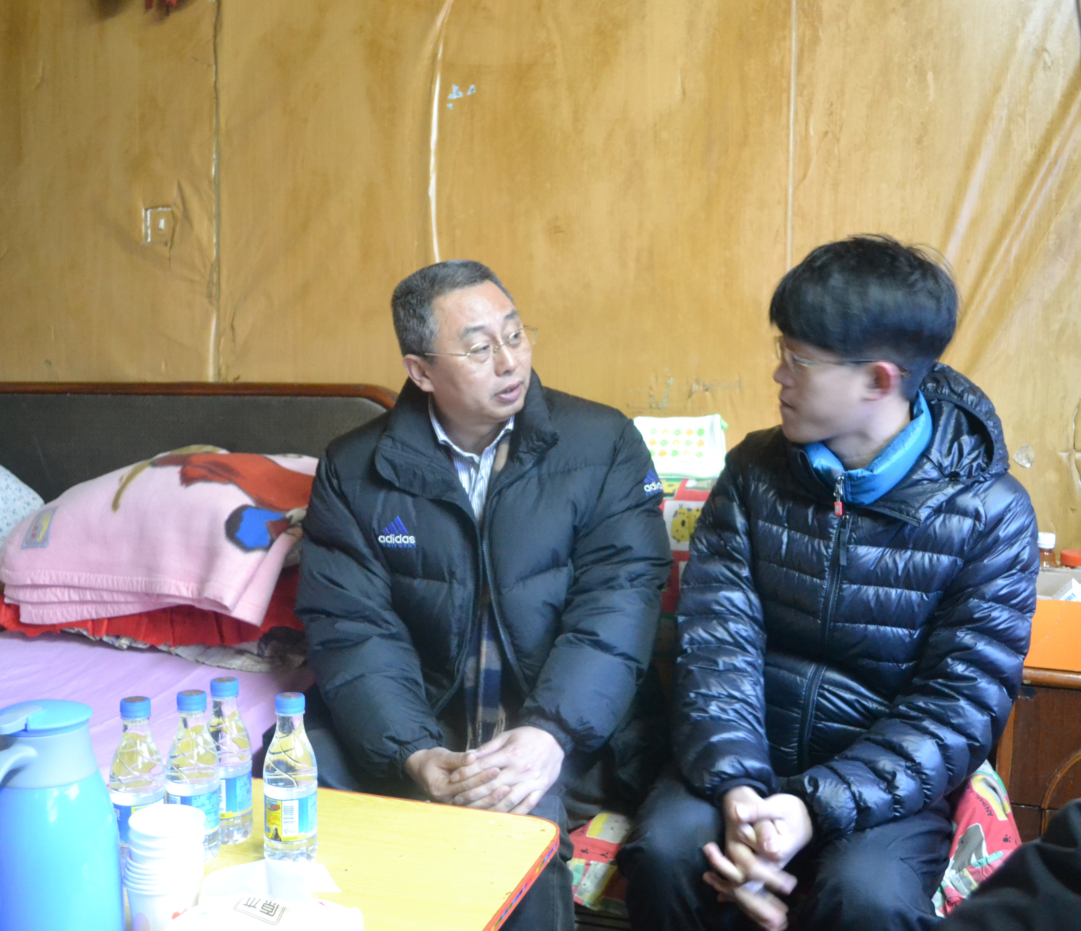 杨淳隆同学是机械工程学院2015级新生,其父患有精神二级残疾,家庭经济压力较大,该生学习认真努力,在校表现积极,尤其热心志愿服务活动。姚校长送上了暖和的棉被和慰问金,并与学生家长亲切交流,详细了解学生生活、学习情况当得知杨淳隆同学正为如何提高数学成绩而烦恼时,姚校长以亲身经历给其指点迷津,他勉励杨淳隆同学自立自强,用双手为未来拼搏。杨淳隆同学家人及本人对学校领导和学院的关心呵护表示由衷感谢,杨淳隆同学表示一定会努力上进,铭记学校恩情。