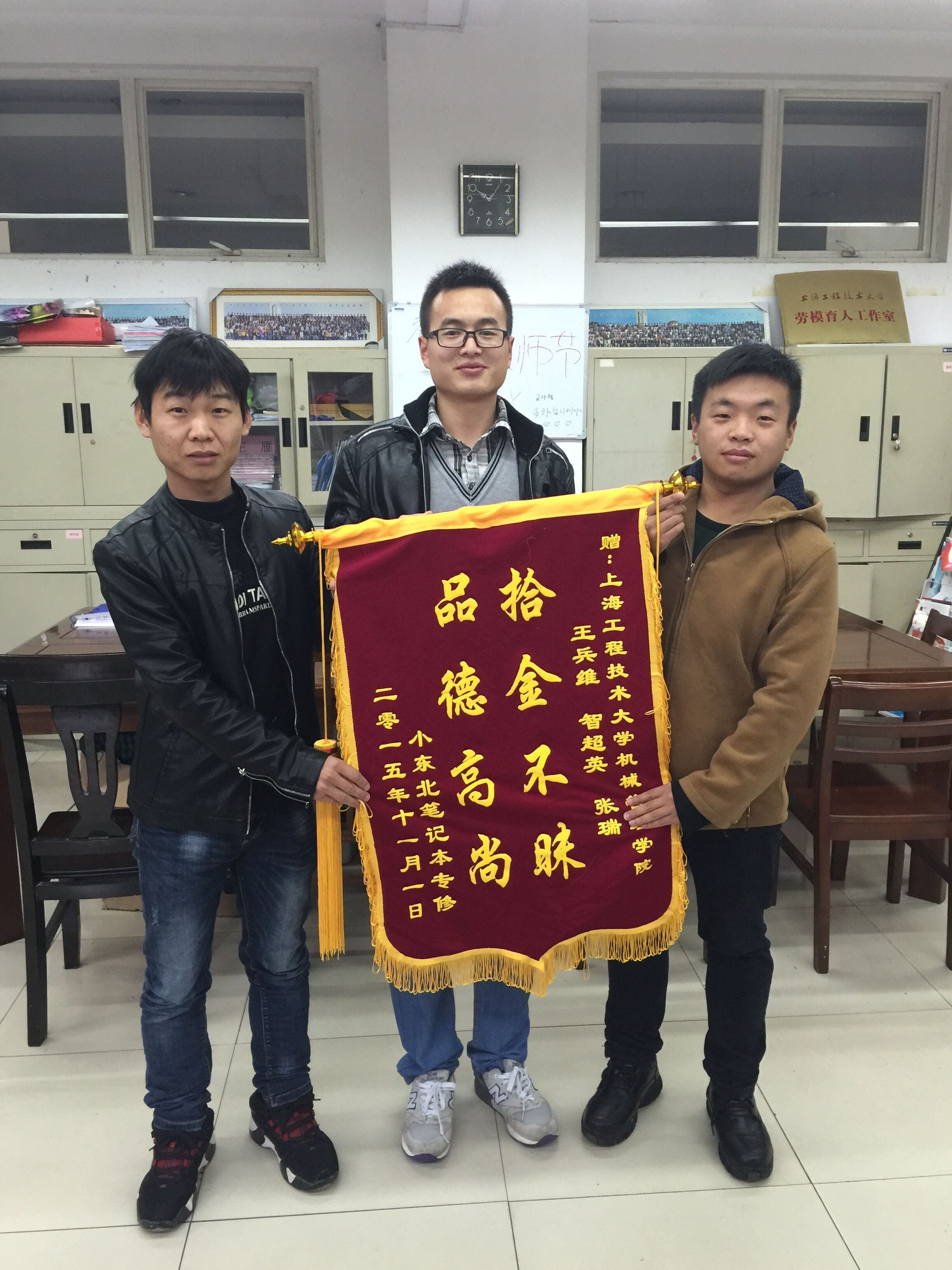 校周边商户小东北笔记本专修业主在10月23号晚上8点左右,路过文汇路的时候不慎将随身携带的装有3000左右现金、身份证、驾驶证、若干银行卡等贵重物品的包遗失,回到店中才发觉,家人也甚是焦急,他抱着试一试的态度来到大学城派出所调查路面监控,模糊的画面、川流不息的人群、再加上时间过去那么久,顿时感到心灰意冷,就在即将放弃寻的时候,我机械工程院的张瑞、王兵维、智超英三位同学拿着捡到的包送到了大学城派出所,让他的包失而复得,在和民警的再三询问下,三位同学才透漏出他们的身份信息。
