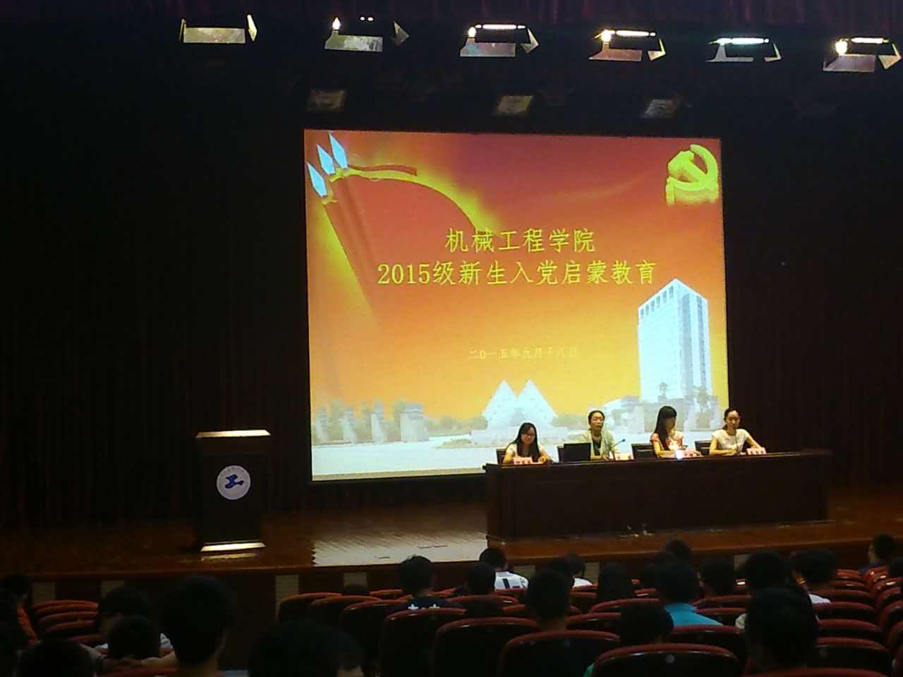 2015年09月18日下午,上海工程技术大学机械工程学院党委在志宏堂召开2015级新生入党启蒙教育大会,学院党委书记虞蓉、副书记梅元媛、学生科创党支部柳苗苗以及组织员李雪苗出席会议。