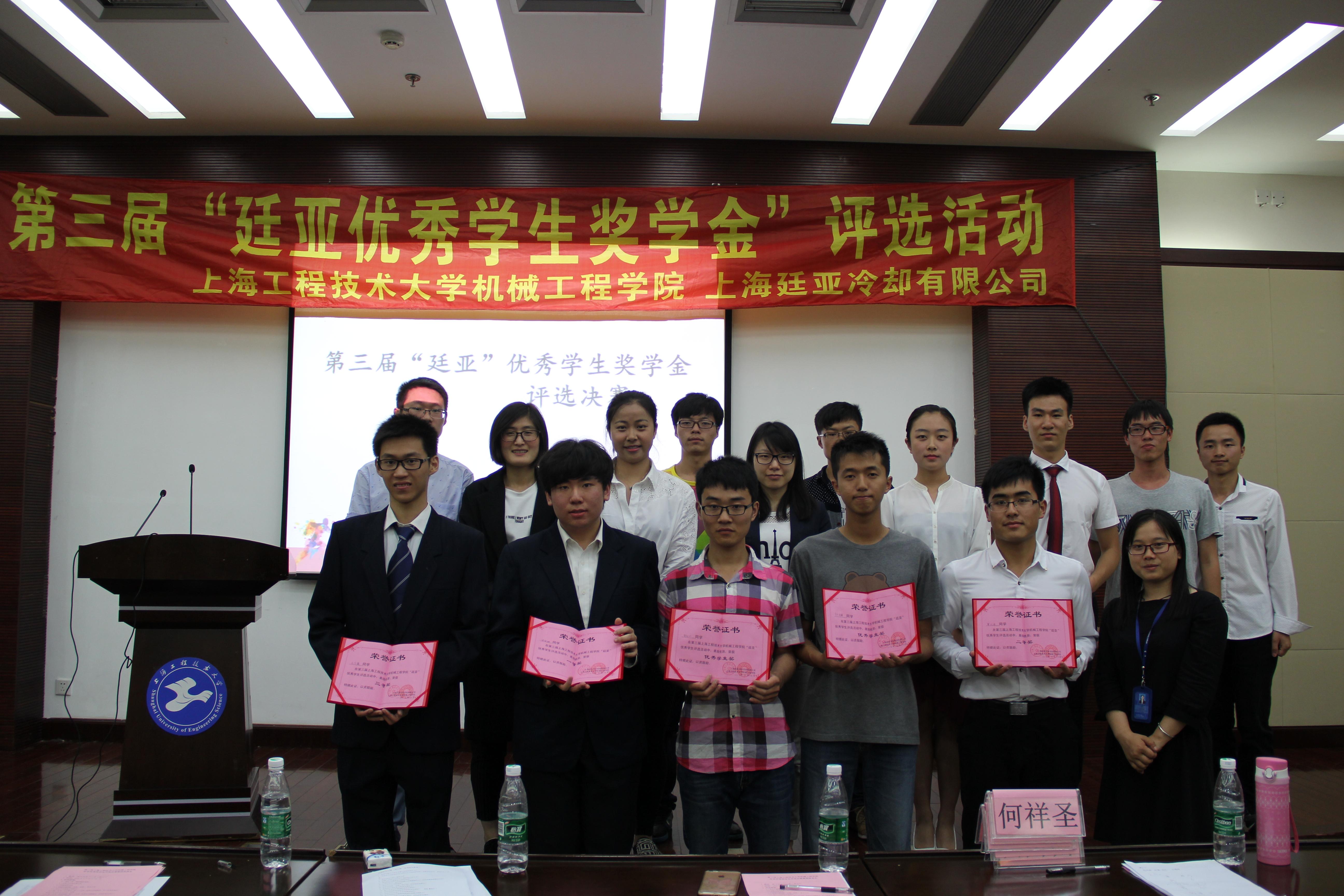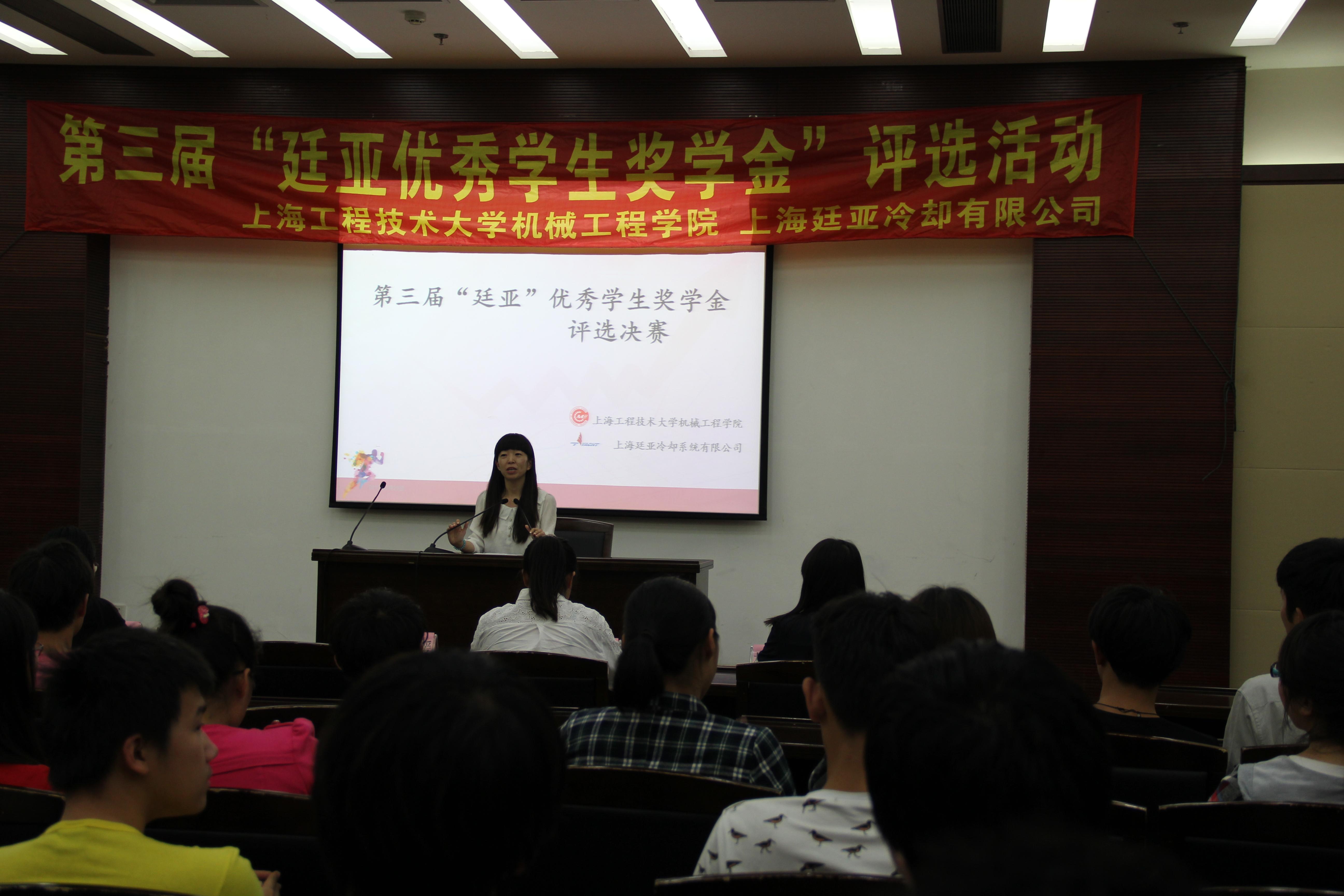 2015年5月29日下午2点,机械工程学院在图文信息中心第三报告厅举办第二届上海工程技术大学廷亚优秀奖学金评选总决赛暨颁奖典礼,机械工程学院党委副书记梅元媛老师、上海廷亚冷却系统有限公司市场部经理宣琳娜、机械工程学院辅导员王淼、柳苗苗老师出席了此次活动。