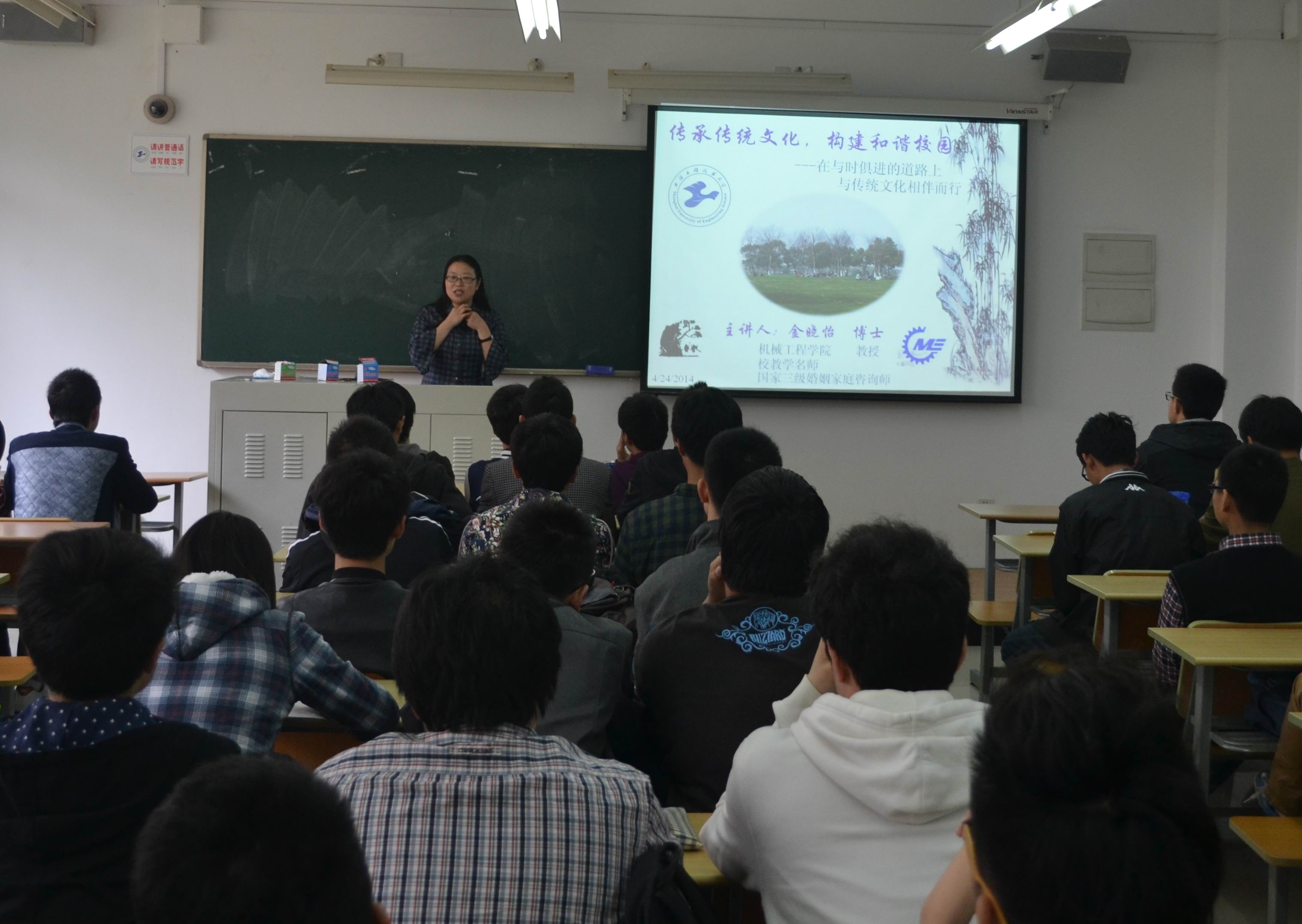 为了加强中华优秀传统文化教育,深化中国特色社会主义教育和中国梦宣传教育,积极推进“广富林计划”的开展,机械工程学院特邀金晓怡教授和陆文老师为广大学生进行了两场别开生面的讲座。