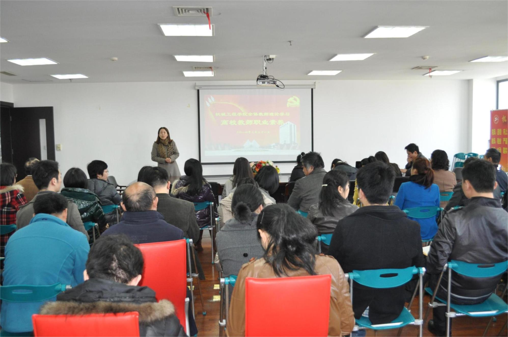 321下午,继学校党的群众路线教育实践活动总结阶段工作之后,机械工程学院党委组织全体教师参加理论学习第二讲—高校教师职业素养,学院全体教师如期参加了会议。会议由学院党委书记虞蓉主持。