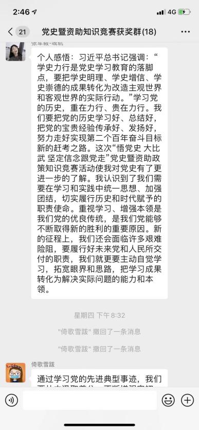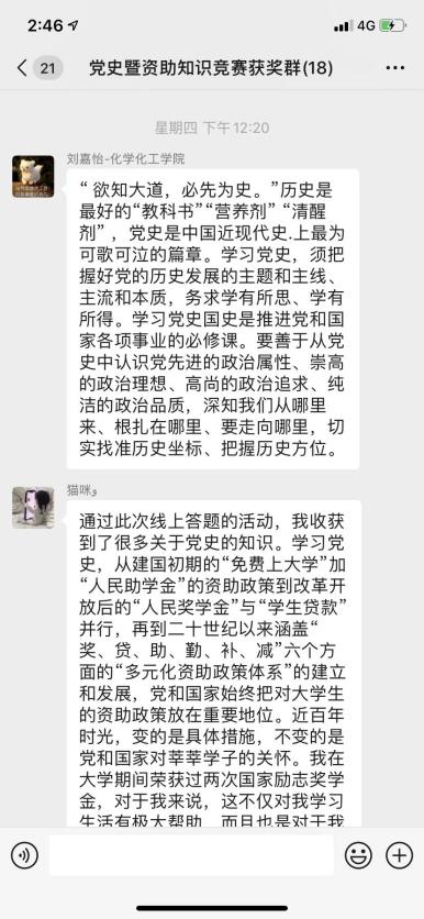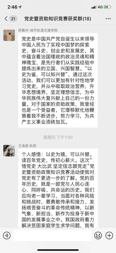 参赛学生表示,通过参加此次知识竞赛,不仅督促自己学习党史知识,同时加深了对国家资助政策的了解和认识。通过资助政策的学习,学生能够真切感受到党和国家对大学生的关怀和呵护,并纷纷写下自己的获奖感言。化学化工学院的白文婷同学在获奖感言中谈到:“近百年时光,资助政策不断完善革新,变的是具体措施,不变的是党和国家对莘莘学子的关怀。我在大学期间荣获过两次国家励志奖学金,对于我来说,这不仅对我学习生活有极大帮助,而且也是对于我在学习热情上的莫大激励和鼓舞”。城市轨道交通学院的获奖同学王逸君在获奖感言中写到:“党和国家着力解决贫困家庭学生求学问题,我的身边有很多同学曾获得过国家励志奖学金,这一定程度上减轻了他们上学的经济压力,也让我们感受到了党和国家的关怀,感受到了社会主义制度的优越性,激发了我们的社会责任感。”
