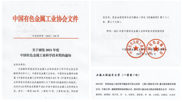 近日,中国有色金属工业协会发布了《关于颁发2021年度中国有色金属工业科学技术奖的通知》,由开云kaiyun官网邓胜祥教授牵头申报的《有色冶金工业炉窑节能技术开发与应用》项目荣获中国有色金属工业科学技术奖一等奖。上海工程技术大学为该项目第一完成单位,参与单位包括中南大学、遵义铝业股份有限公司、贵州省六盘水双元铝业有限责任公司等单位。