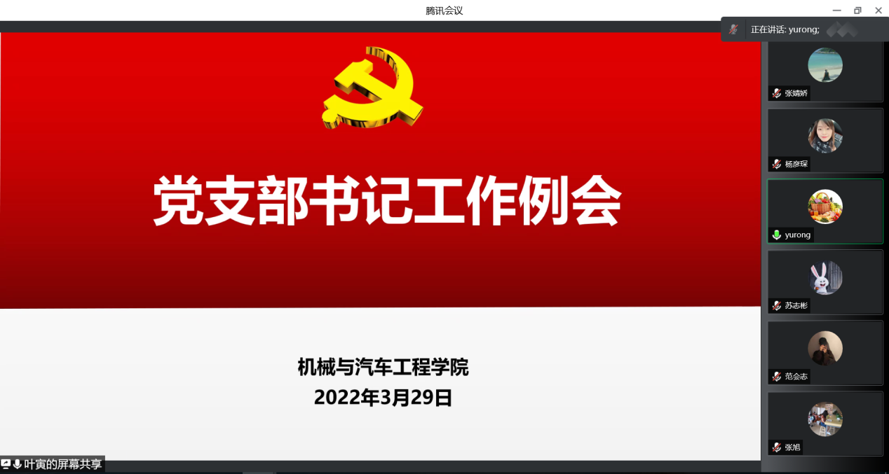 为进一步发挥党的政治优势、组织优势,高效、有序推进近期重点工作,3月29日上午,开云kaiyun官网党委线上召开支部书记工作例会,会议由学院党委书记虞蓉主持,学院党委全体支部书记、支部委员参会。