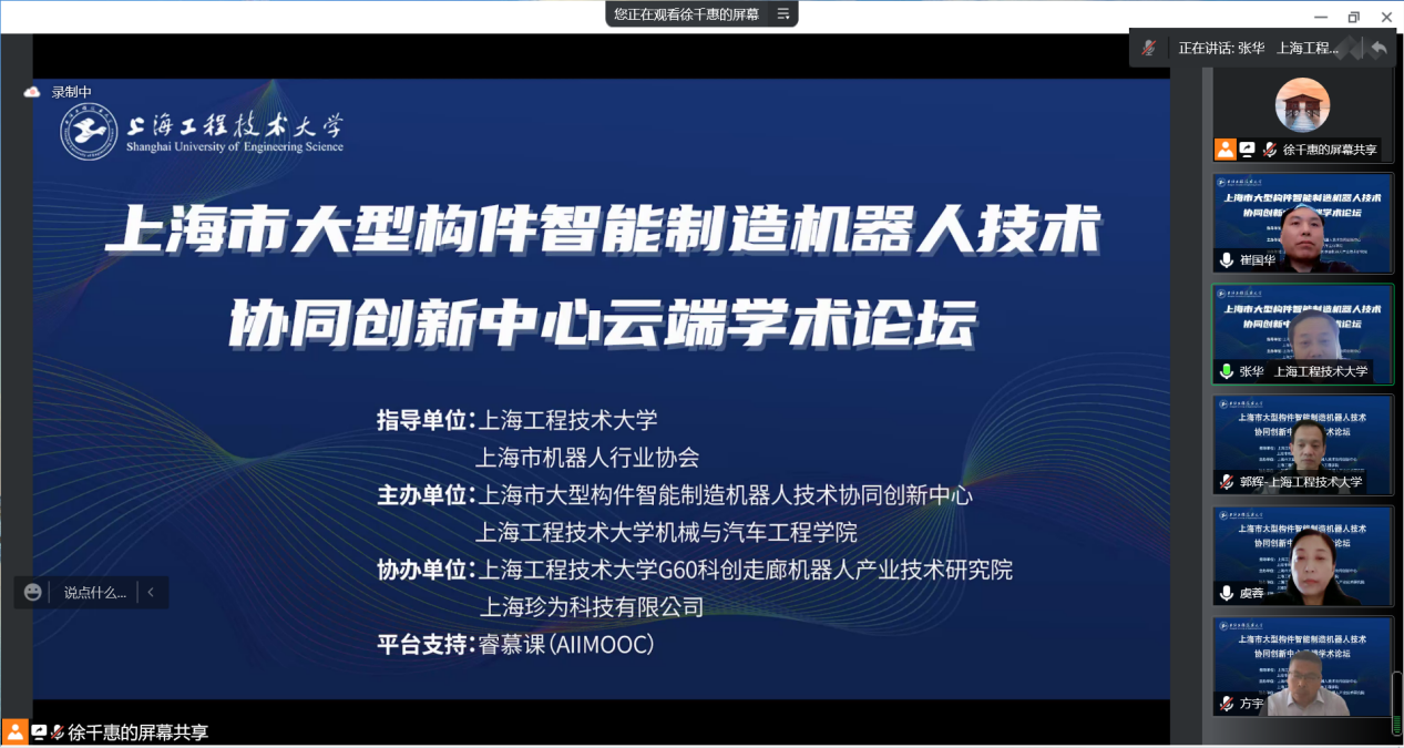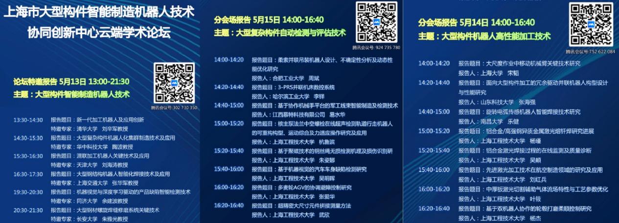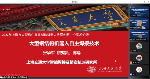 此次云端学术论坛于5月13日-5月15日为期三天线上召开,6场专家主题报告、16场分会场报告,20多位校内外学者共同探讨大型构件智能制造机器人的发展前沿与挑战机遇,促进航空航天、船舶海工、新能源汽车、轨道车辆等领域大型构件智能制造机器人技术的学术交流与应用创新。