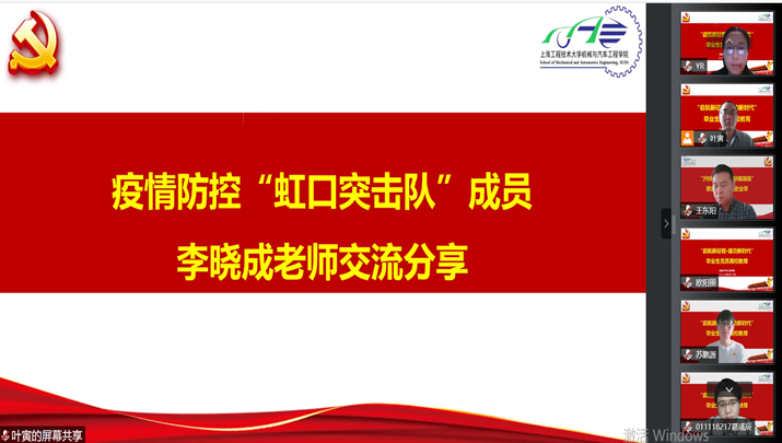 此次离校教育,学院邀请了曾参与疫情防控“虹口突击队”成员李晓成老师,李老师结合支援虹口校区一线防控的经历,分享了从如何直面困境到做好突击工作的心路历程,并寄语毕业生站好最后一班岗,疫情防控不松懈。在毕业生党员“初心和使命”分享环节,车辆工程专业本科生党支部的张在程同学“以行动坚守初心,用奋斗点亮青春之火”为题,讲述自己作为第七党小组组长参与疫情防控的真实感受,表示要坚守自己的初心,树立远大理想,奋斗的青春最美丽。机械工程专业本科生党支部的葛彧辰同学,围绕“感恩程园四载之育,百年接力强国有我”,鼓励青年要接好“新时代”接力棒,积极投身祖国建设的伟大征程中。会上,学院分别播放了2017届毕业生党员刘洋和2019届毕业生党员詹鑫的寄语视频,二位优秀校友用真情实感,表达了对母校的感激,与2022届毕业生党员共勉,不负韶华、不负时代、不负人民,在青春的赛道上奋力奔跑,一起向未来。