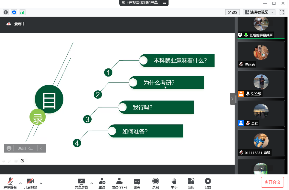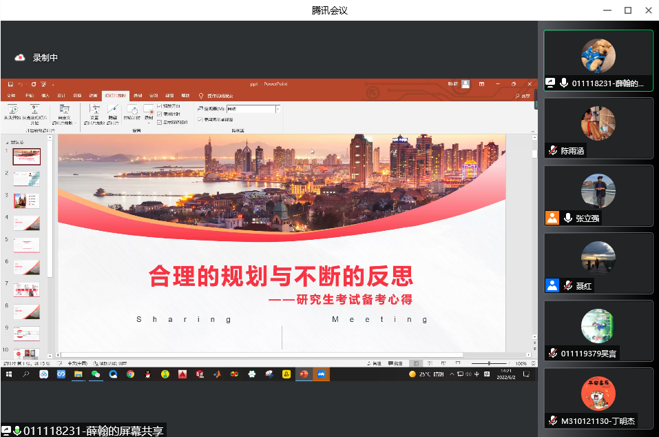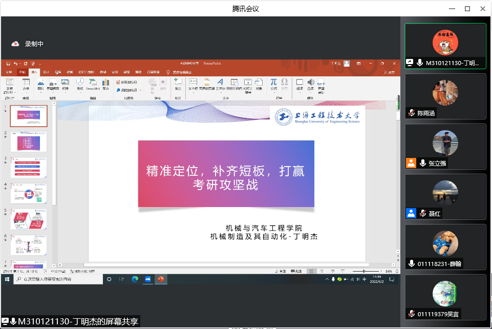 随后,已被同济大学录取的薛翰同学分享了他备考的心路历程,经验教训和上岸心得;我校研一在读的学长丁明杰分享了考研准备期信息的获取途径及后期每门课程的复习经验与方法,同时也建议学弟学妹们寻找研友,适当运动,以最好的状态迎接考试。