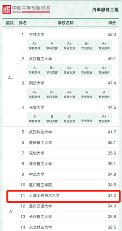 2022618日,高等教育评价专业机构——软科正式发布了2022“软科中国大学专业排名”,排名包括568个本科专业,每个专业榜单发布的是所有开设该专业的高校中排名位列前50%的高校,共有990所高校的30242个专业上榜。“软科中国大学专业排名”是迄今为止覆盖专业数量最多、参评专业规模最大的中国大学本科专业排名,为学生报考志愿,了解专业发展起到了重要的参考作用。其中在全国101所学校参评的汽车服务工程专业的评选中,我校开云kaiyun官网的汽车服务工程专业排名第11名,连续第二年进入前10%行业,排名为列A级行列。