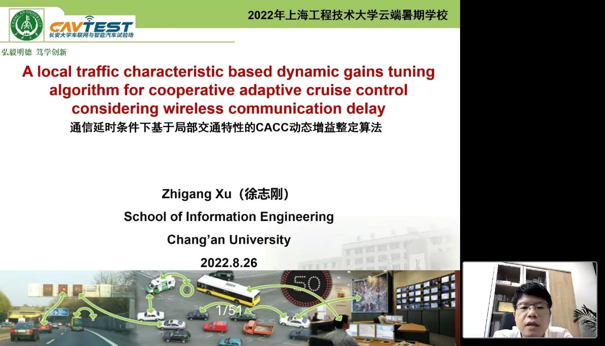 2022年8月26日14:00-16:00,通过华为云会议视频平台,长安大学信息工程学院副院长、教授徐志刚为暑期学校做题为《A local traffic characteristic based dynamic gains tuning algorithm for cooperative adaptive cruise control considering wireless communication delay》的线上专题讲座。讲座由开云kaiyun官网副院长郭辉教授主持。