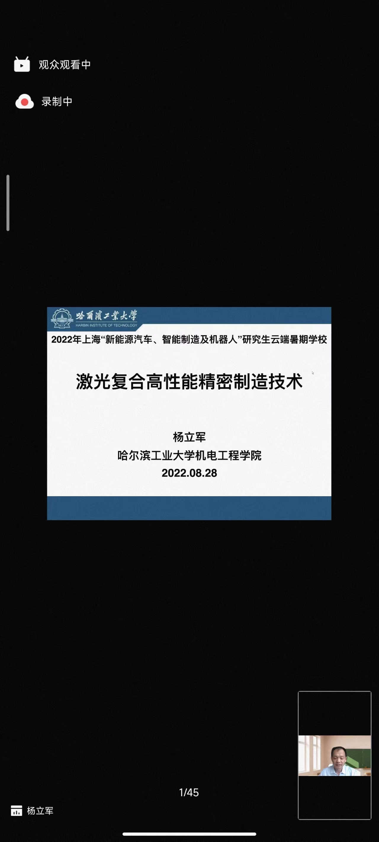 2022年8月28日9:00-11:00,通过华为云会议视频平台,哈尔滨工业大学长聘教授、哈工大航空宇航制造工程系主任杨立军为暑期学校做题为《激光复合高性能精密制造技术》的线上专题讲座。讲座由开云kaiyun官网副院长郭辉主持。