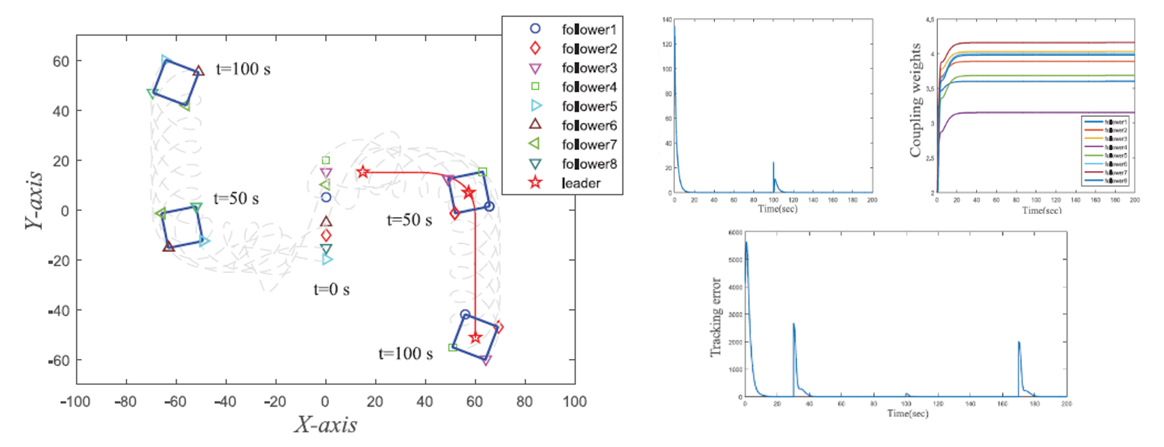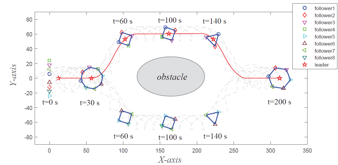 近些年来随着多无人机、多无人车等协同控制技术在军事和民用中发挥着越来越重要的作用,集群智能控制技术得到了飞速的发展,其中分布式多智能体编队控制技术是当前的一个研究热点。该文提出了一种新型的分布式状态观测器设计方案,使得多个智能个体在未知领导者输入的情况下实现一种具有对抗关系的编队队形。这一种编队队形包含两个位置时刻改变的子编队,且它们的编队几何中心具有对称关系。该控制算法仅利用智能体间的输出反馈信息,避免了通信网络图拉普拉斯矩阵的特征值的使用,从而可以实现分布式编队控制。在仿真部分,通过使用多无人车编队的实例展示了该分布式算法的可靠性。该项研究得到国家自然科学基金项目(61991412618032566200320761873318)的资助,合作者为华中科技大学苏厚胜教授和上海工程技术大学李晓航副教授。