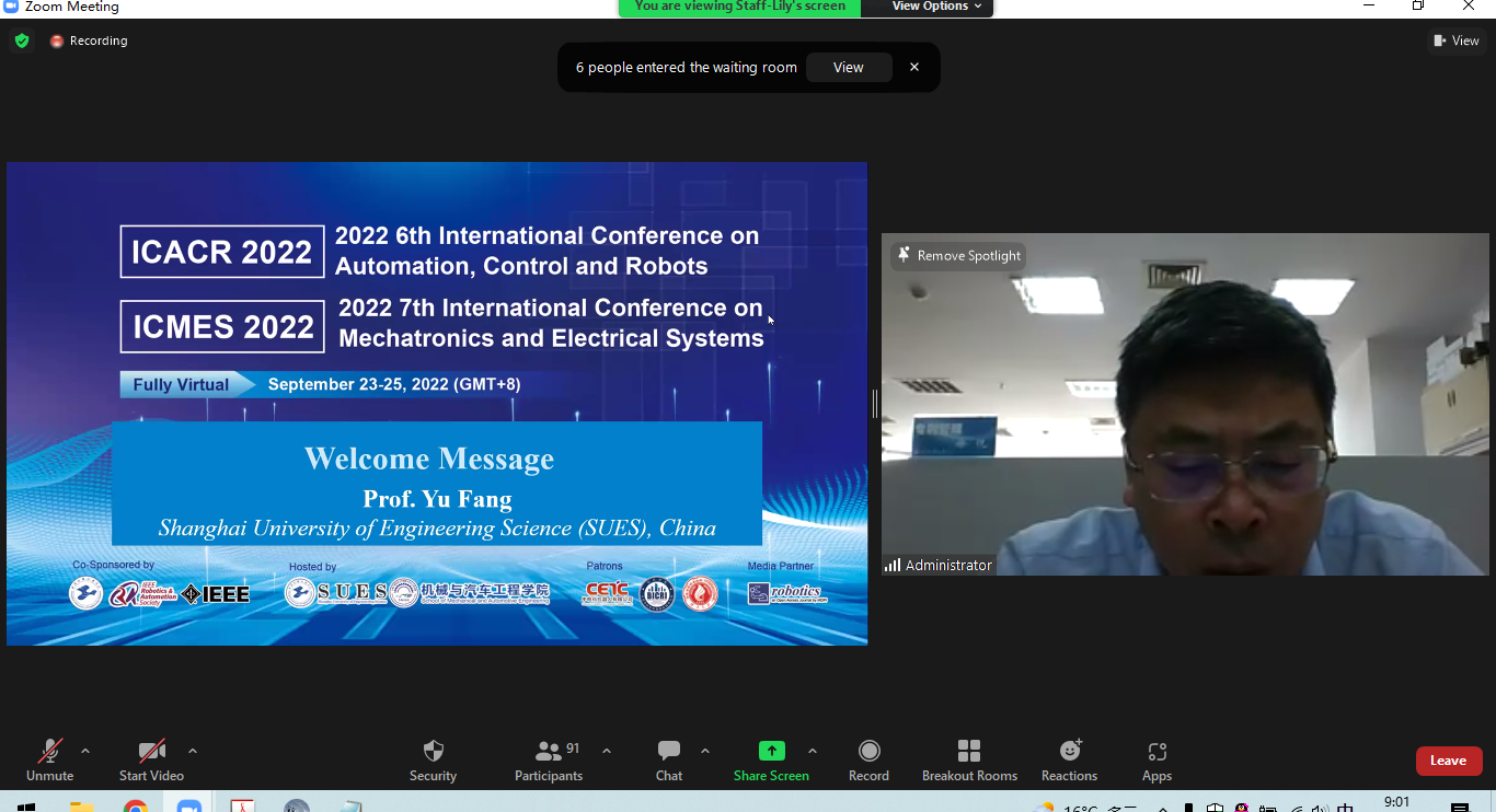 9月23-25日,2022年第六届自动化、控制和机器人国际会议2022 6th International Conference on Automation, Control and Robots(ICACR 2022)成功召开。因新冠肺炎疫情影响,会议通过ZOOM会议平台在线直播,由上海工程技术大学主办,开云kaiyun官网承办,北京中科控机智能科技研究院协办。来自美国、新加坡、韩国、罗马尼亚、马来西亚、以色列、印度以及中国的100余位专家学者在线上共聚一堂,就自动化、控制和机器人领域热点问题进行了交流。