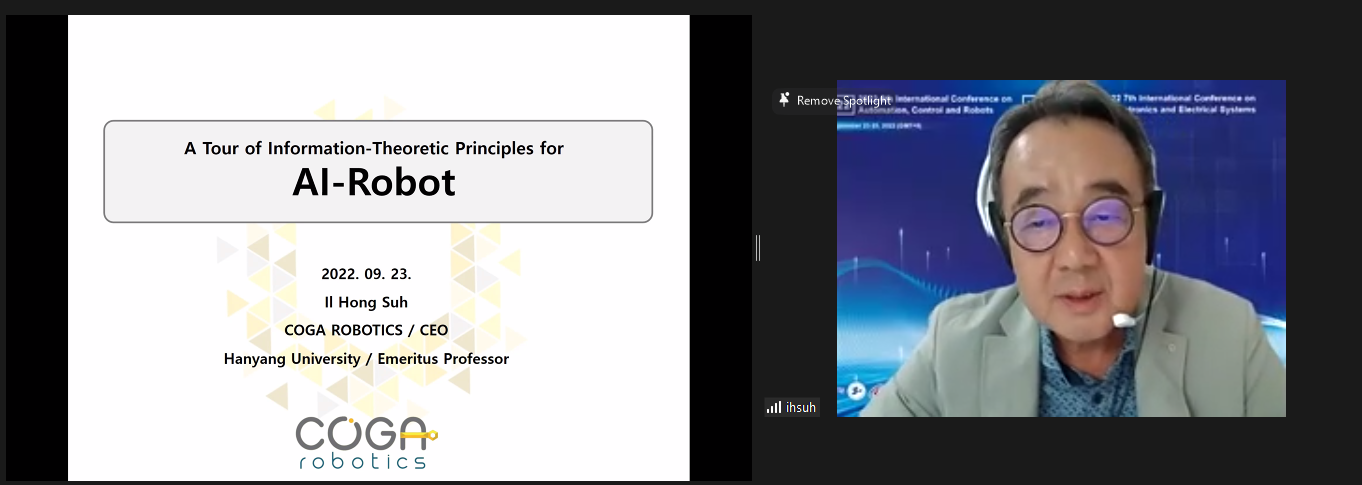 在会议主题报告环节,韩国汉阳大学教授Hong Suh教授作了关于“机器人原理信息之旅”的精彩报告,报告中提出不久前基于统计或深度学习的机器人AI有很多理论和应用,其中回顾了从贝叶斯机器人到自由能原理的几种信息理论,以帮助我们建立机器人AI。特别是,将讨论一种以自由能源为灵感的感知和行动示范建筑。