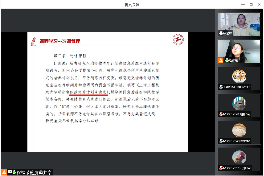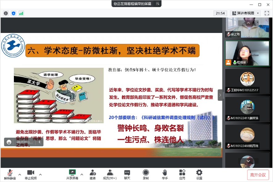 全体新生围绕《上海工程技术大学学籍学历管理工作实施细则》、《上海工程技术大学研究生管理规定》、《上海工程技术大学研究生违纪处分管理办法》、《上海工程技术大学关于各类考核考场规章、违规界定和处分管理规定》等14个研究生培养管理制度文件进行专题学习。学习中,程福荣老师强调各位研究生同学要严格遵守校规校纪、落实好学风建设相关要求,防微杜渐,坚决杜绝学术不端。要秉承“内化于心、外化于行”的基本原则,严格自我要求,建设良好学风,做带头遵守校规校纪的模范。