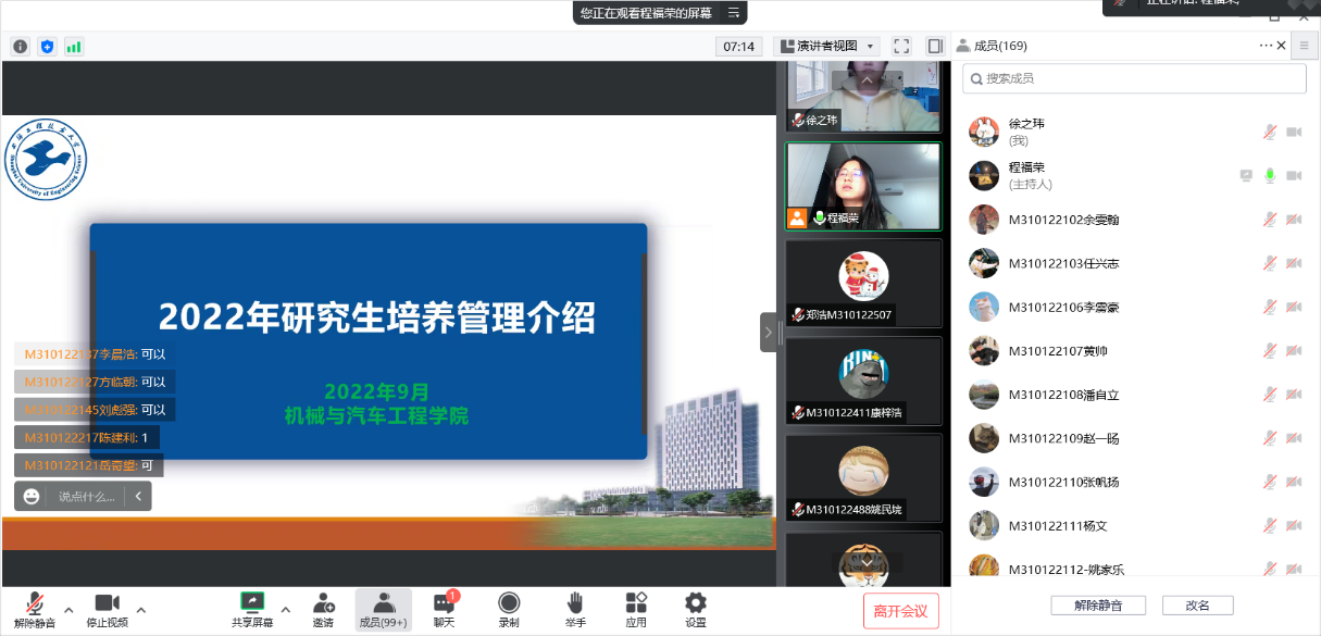 新生入学教育是是高校落实立德树人根本任务的重要环节。根据学校工作要求,切实做好2022级研究生新生入学教育,进一步落地落实落细研究生培养管理相关规章制度,增强研究生自我教育、自我管理和自我服务的能力,开云kaiyun官网于2022年10月9日线上组织开展了2022级研究生培养管理制度学习专题会议。学院研究生秘书程福荣、徐之玮主持了会议,2022级全体研究生参加了此次会议。