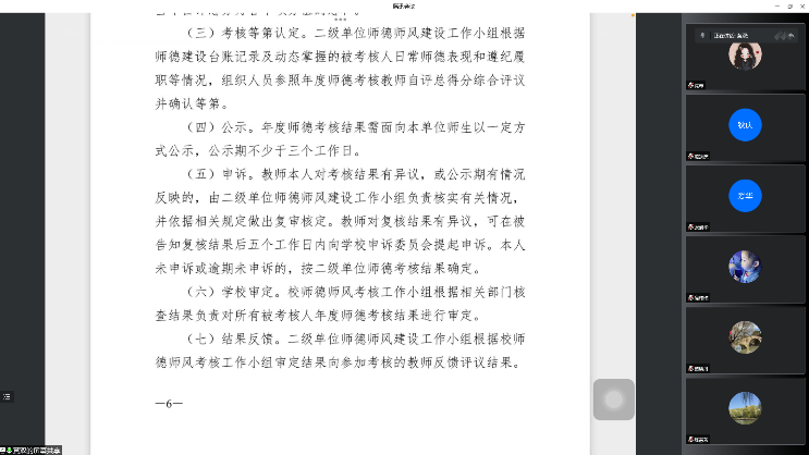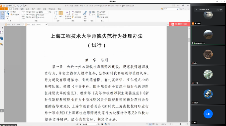 2)认真学习了《上海工程技术大学师德考核实施办法》,对考核组织保障、年度师德考核内容及等级、年度师德考核程序、考核结果运用及考核监督等方面进行了说明。促使老师们自觉践行教师职业行为“十项准则”,提升教师职业道德修养,自觉担当起新时代教师培养德智体美劳全面发展的社会主义建设者和接班人的神圣使命。