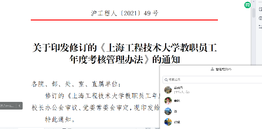 8)学习了《上海工程技术大学教职员工年度考核管理办法》,对考核对象、考核内容、考核等次级标准、考核结果及应用等进行了详细的研讨。年度考核管理办法立足正确评价教职员工的德才表现和工作实绩,激励教职员工认真履行岗位职责,不断提高政治和业务素质。