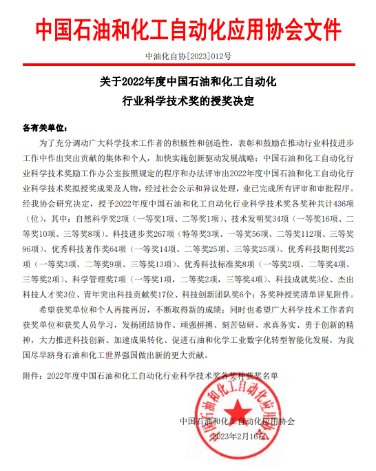 中国石油和化工自动化行业科学技术奖是经国家科学技术部批准(国科奖社证字第0109号)设立的面向全国范围的行业性科学技术奖项,具有直接提名国学科学技术奖的资格。
