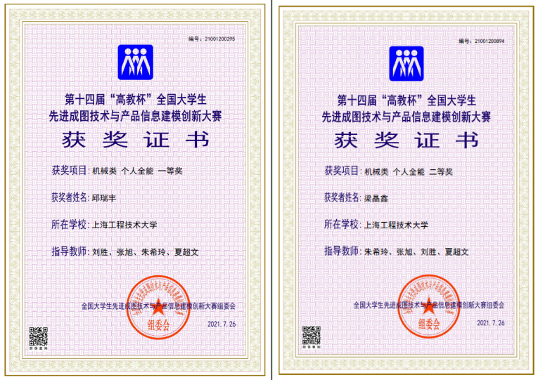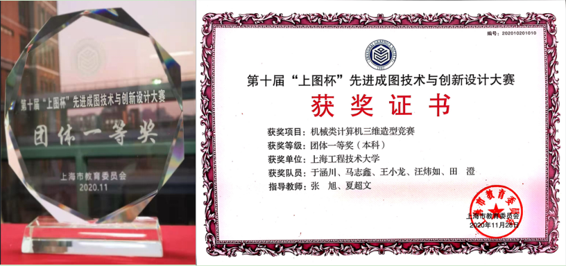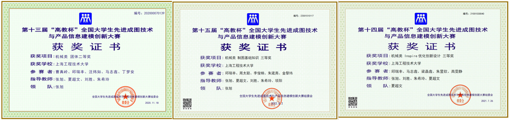 通过组织“上图杯”竞赛的前期培训、选拔,每年遴选出多只二维团队、三维团队和创新团队,涉及涵盖100多人次参加竞赛,指导老师9人。参加包括机械类二维、三维建模竞赛,创新设计大赛三个类别的比赛,每年获得上海市团体奖10多项,个人奖20多项。其中代表性的奖项如下: