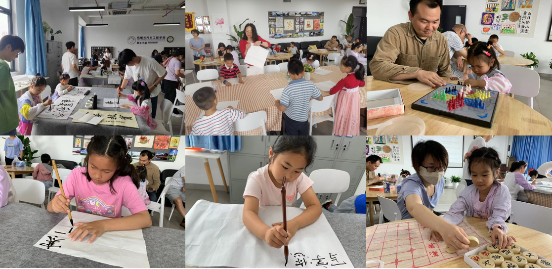 在8B605书画展演分会场,孩子们有的带来了自己的书画作品,有的进行现场创作。学院工会还特意邀请了书画老师,现场手把手对孩子们进行指导。本次书画展演以“童心童趣”为主题,通过孩子们的作品来展现他们心中的奇思妙想,现场可以看到孩子们充满诗意和幻想的表达以及他们无限的创意。此外,还为不同年龄段的小朋友提供了各种各样的趣味游戏。亲子游戏环节,家长们和孩子们一起玩象棋、五子棋、飞行棋等各类棋类游戏,锻炼了孩子们的动手能力、反应能力、协作能力、交流能力,亲子游戏也勾起了教工们童年的美好回忆。