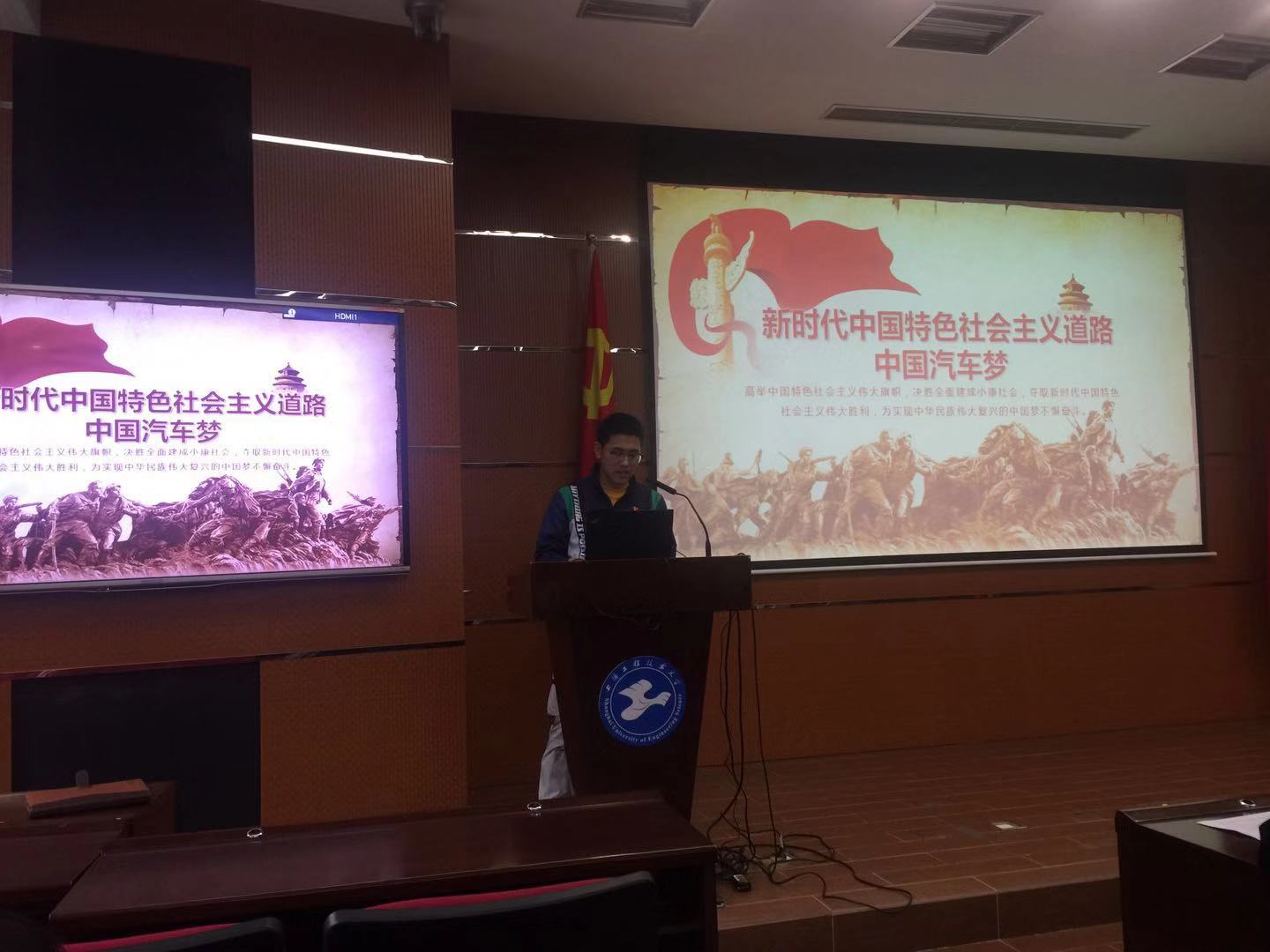 接下研究生王凯和冯倩倩带来“新时代中国特色社会主义道路中国汽车梦”党课内容,他们从改革开放看中国汽车的发展、社会主义新时代下汽车发展的新四化两个方面讲述了中国汽车业的发展历程,同时向我们发出了《新时代,新趋势,学生党员在行动》的响亮口号。