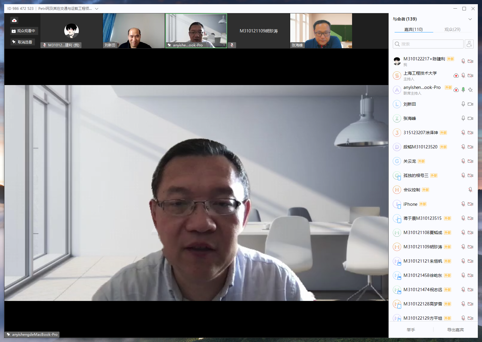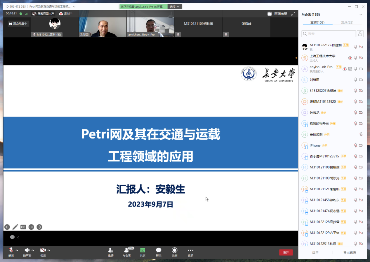 2023年9月7日14:00,通过华为云会议视频平台,长安大学博士生导师,信息工程学院院长安毅生教授为暑期学员做题为《Petri网及其在交通与运载工程领域的应用》的线上专题讲座。讲座由开云kaiyun官网副院长刘新田教授主持。