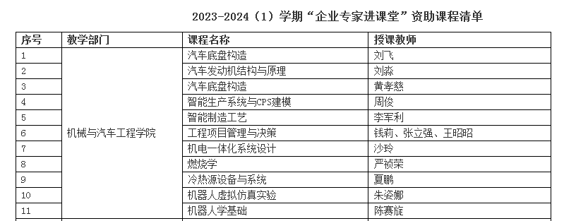 为充分发挥产业优势和企业协同育人作用,加强校企合作,进一步深入推动产教融合实践与探索,教务处组织了2023-20241)学期“企业专家进课堂”申报工作。经个人申报、部门推荐、教务处审核,《汽车底盘构造》等 81门课程即将开展“企业专家进课堂”工作,我学院共有11门课程获得资助。请各教学部门按照要求,认真组织开展相关工作,邀请企业专家走进课堂,与校内授课教师共同完成课程教学工作,创新产教融合协同育人实践。