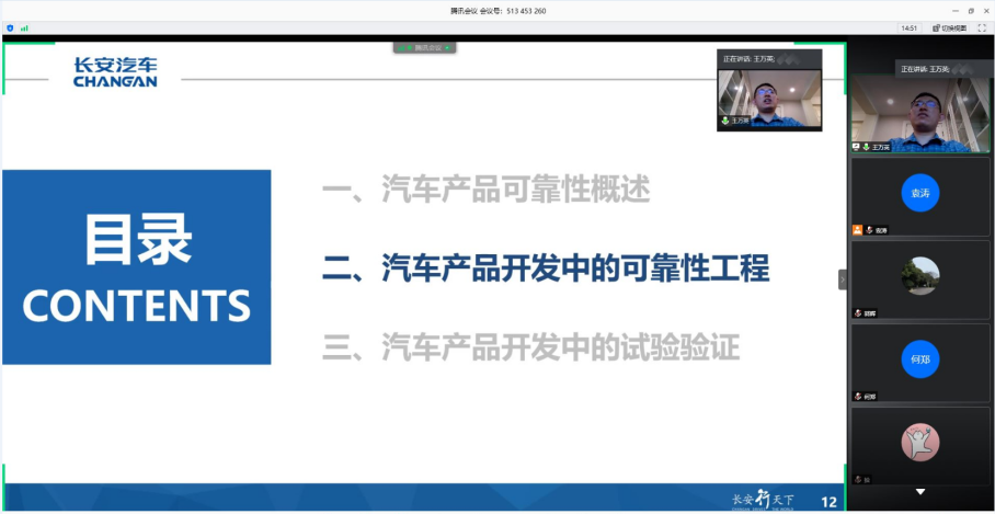 视频学术报告中,王博士系统讲解了汽车产品可靠性和开发流程;结合企业实施案例,就可靠性和稳健性工作流程、质量历史分析、边界分析和接口分析、干扰因素等,进行了图文并茂的诠释;最后,王博士从预研、方案、设计/验证、投产四个阶段和长安汽车的试验验证体系,讲解了试验验证的实施和效果。