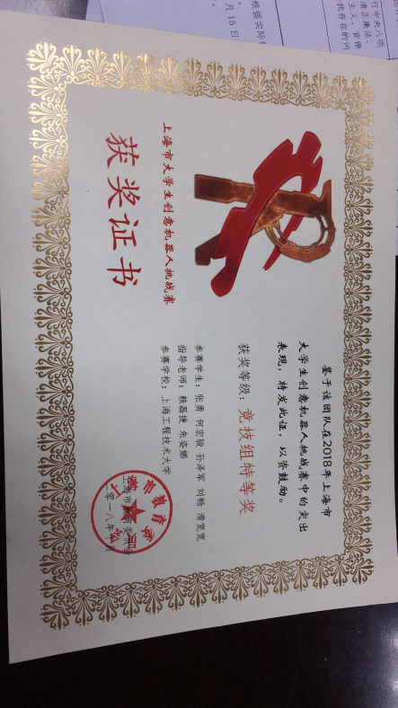 2019.05 | 上海市教育委员会 | 第八届上海市大学生机械工程创新大赛 | 二等奖 |